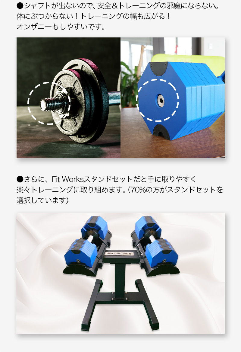 スタンドは本製品(ダンベル)2点をセットすることが可能です。実際に購入頂いたお客様からは、「かがまずにダンベルを使用できるから便利」「見た目がかっこよくてモチベーションになる」などのご感想を頂いております。私たちも自宅で活用していますが、スタンドがないと毎回地面に置くか、別途棚の上などに置くことになります。これは長い目で見ると結構なストレスになります。長く愛用されるなら、【スタンドあり】で購入されることを強くおすすめ致します。後から単品での購入も可能ですが、セット価格がトータルで最もお得に購入できます。