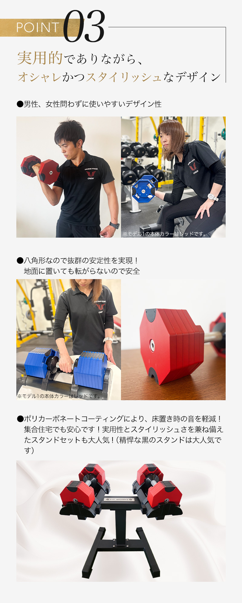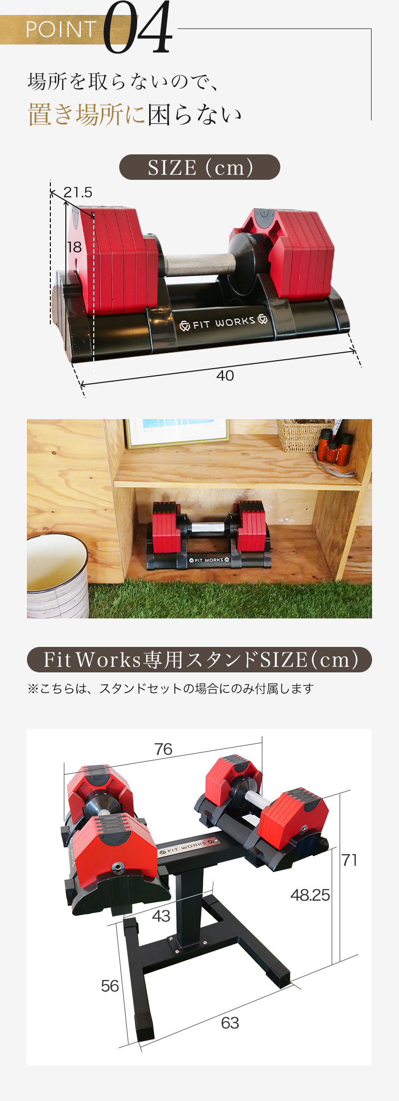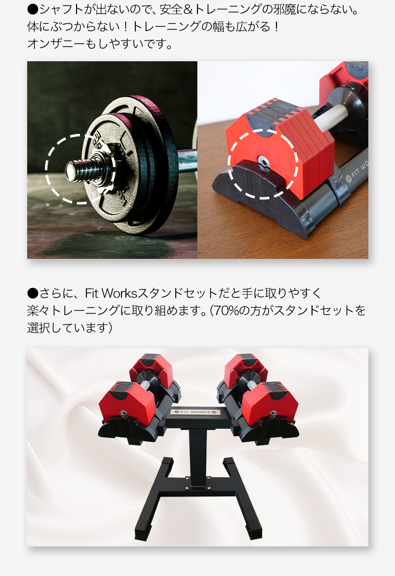スタンドは本製品(ダンベル)2点をセットすることが可能です。実際に購入頂いたお客様からは、「かがまずにダンベルを使用できるから便利」「見た目がかっこよくてモチベーションになる」などのご感想を頂いております。私たちも自宅で活用していますが、スタンドがないと毎回地面に置くか、別途棚の上などに置くことになります。これは長い目で見ると結構なストレスになります。長く愛用されるなら、【スタンドあり】で購入されることを強くおすすめ致します。後から単品での購入も可能ですが、割高になります。