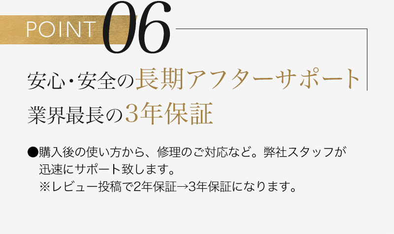 2年以内に生じた故障は修理・一部部品の交換などの対応をさせて頂きます。(レビュー投稿で2年から3年に1年延長いたします。)