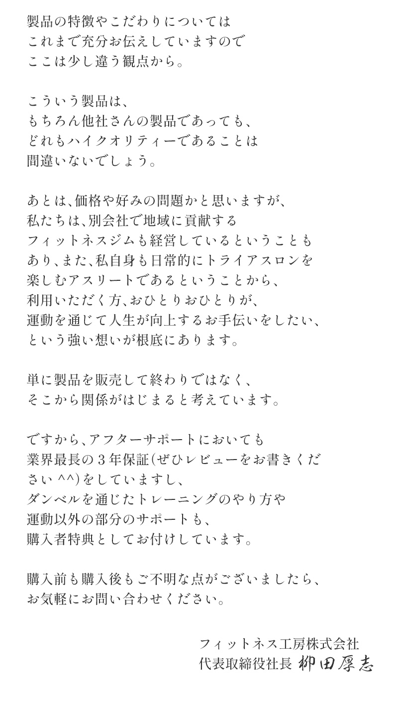 フィットネス関連商品を取り扱う専門会社【フィットネス工房株式会社】が販売しております。「フィットネスにより、心身ともに健康で幸せな日々を送る人々を支える」というビジョンを掲げ、カラダとココロを健康に導くプロダクトを企画・開発・販売している会社です。会社のホームページを以下に記載しておりますので、ぜひお立ち寄りくださいませ。