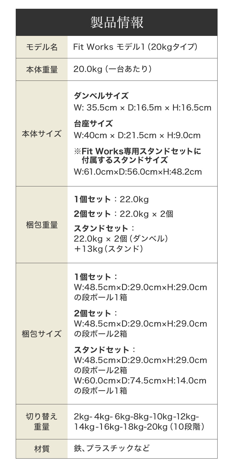ダンベル本体とダンベルをセットする台座の他に、取扱説明書、お礼状、納品書を同梱しております。2個セットの場合は安全性を考慮して2口梱包でお届け致します。