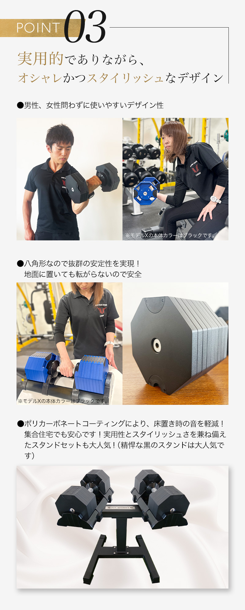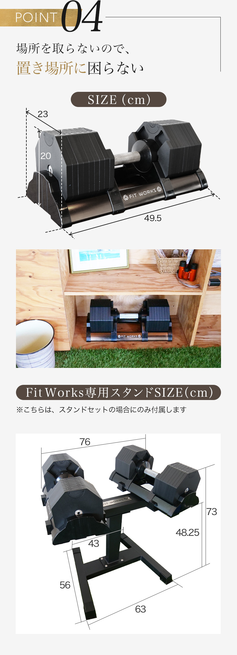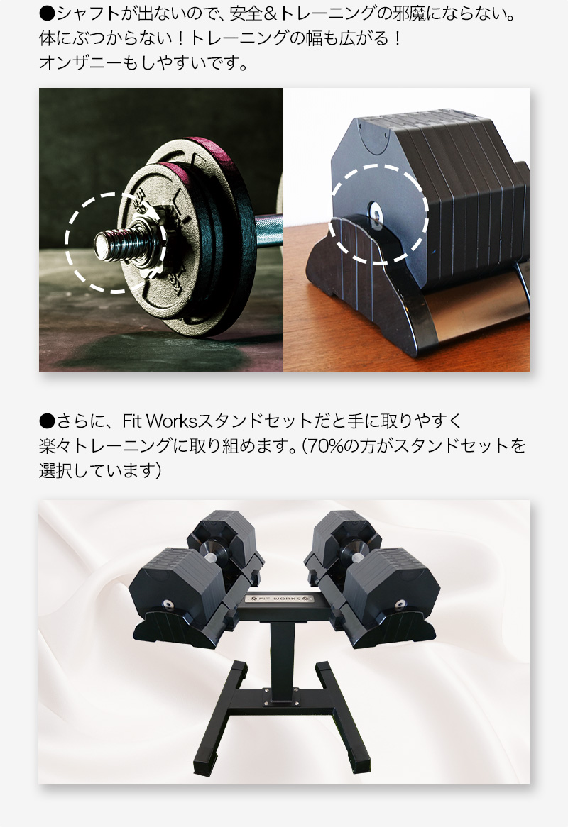 スタンドは本製品(ダンベル)2点をセットすることが可能です。実際に購入頂いたお客様からは、「かがまずにダンベルを使用できるから便利」「見た目がかっこよくてモチベーションになる」などのご感想を頂いております。私たちも自宅で活用していますが、スタンドがないと毎回地面に置くか、別途棚の上などに置くことになります。これは長い目で見ると結構なストレスになります。長く愛用されるなら、【スタンドあり】で購入されることを強くおすすめ致します。後から単品での購入も可能ですが、割高になります。