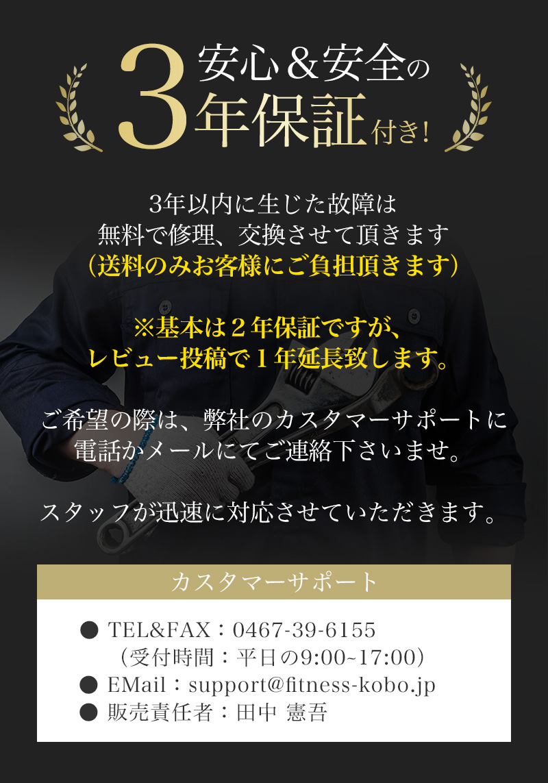 2年以内に生じた故障は修理・一部部品の交換などの対応をさせて頂きます。(レビュー投稿で2年から3年に1年延長いたします。)