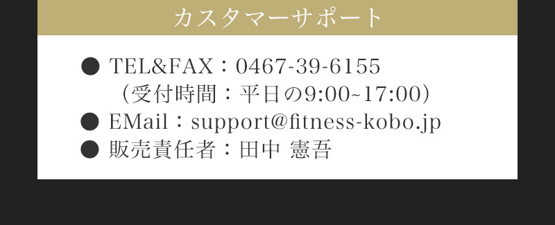商品の欠陥や不良など当社原因による場合には、当該商品の写真または動画を添付の上、カスタマーサポートにメールにてご連絡くださいませ。(ご連絡先メールアドレス:support@fitness-kobo.jp