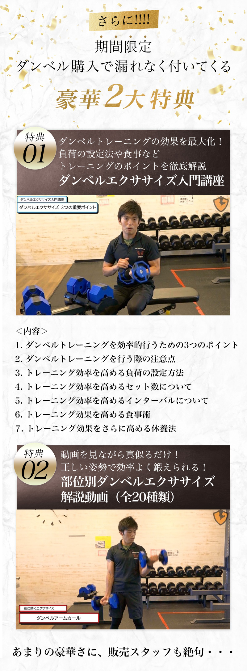もちろん大丈夫です。弊社のダンベルは重量の調節が16段階(2kg〜40kg)まで可能ですので、自分に合った重量からトレーニングを開始できます。重量の参考目安についても、特典動画内でアドバイスしておりますので安心してご利用ください。