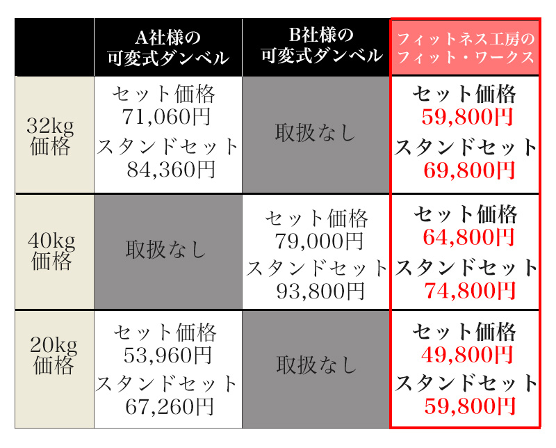 同等性能を持つ他社様のダンベルと比べてもこんなにお得です。