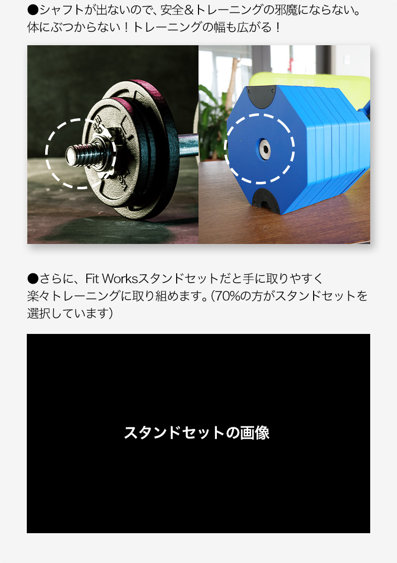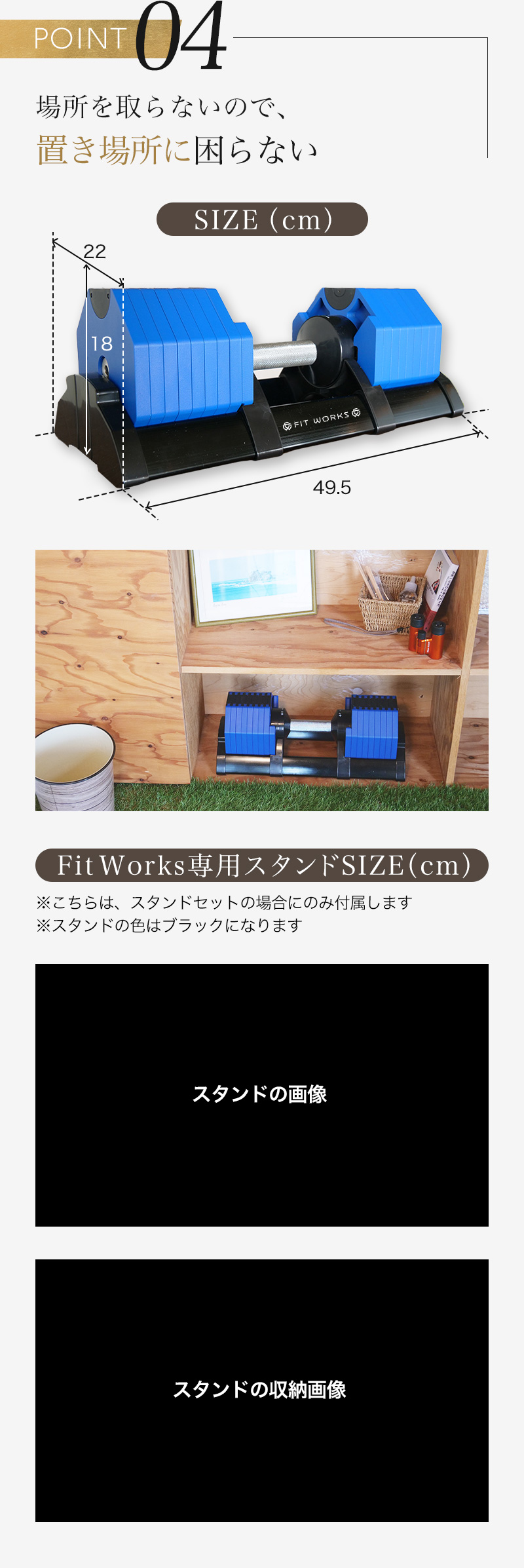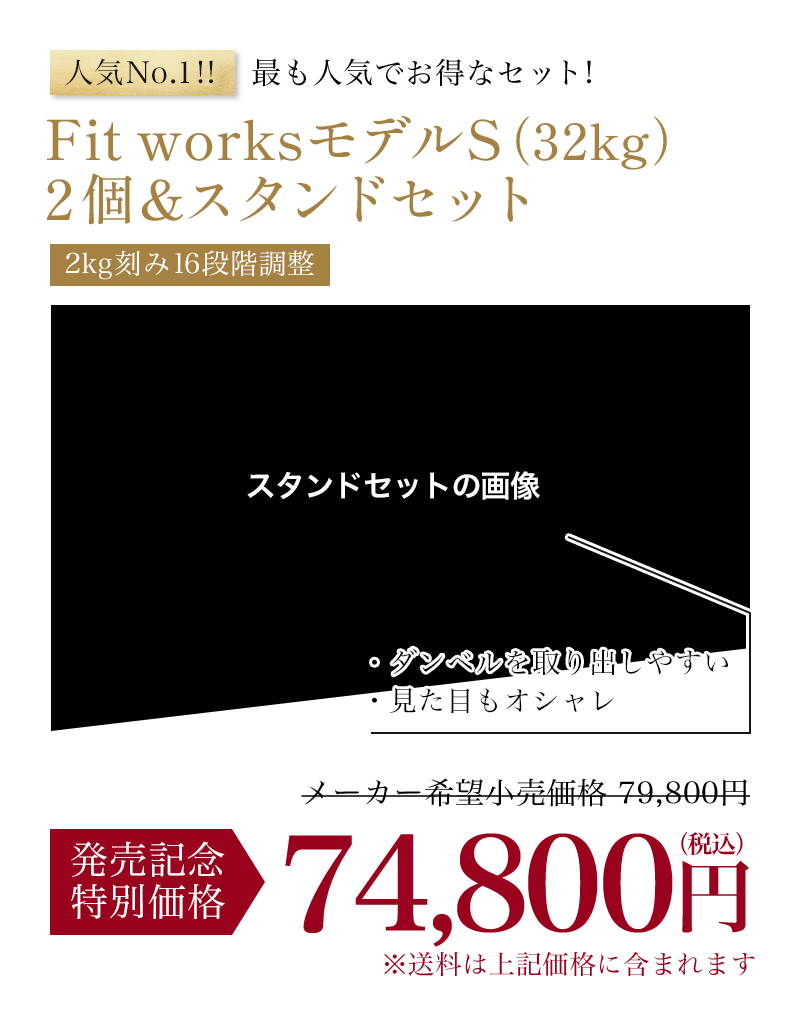 スタンドは本製品(ダンベル)2点をセットすることが可能です。実際に購入頂いたお客様からは、「かがまずにダンベルを使用できるから便利」「見た目がかっこよくてモチベーションになる」などのご感想を頂いております。私たちも自宅で活用していますが、スタンドがないと毎回地面に置くか、別途棚の上などに置くことになります。これは長い目で見ると結構なストレスになります。長く愛用されるなら、【スタンドあり】で購入されることを強くおすすめ致します。後から単品での購入も可能ですが、セット価格がトータルで最もお得に購入できます。