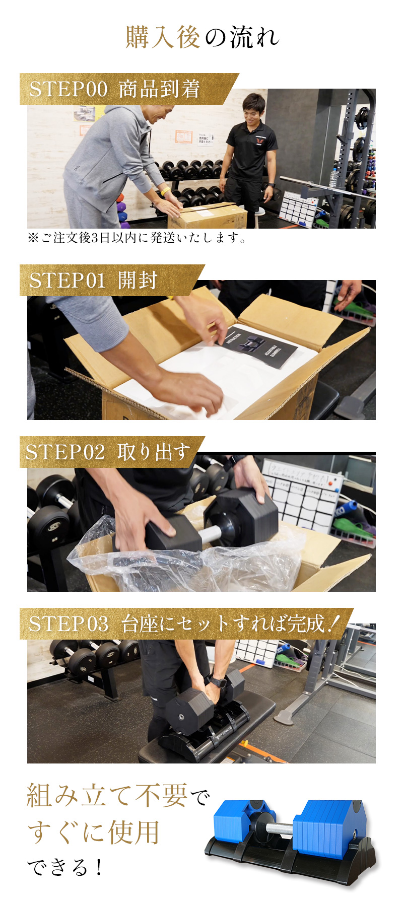 ダンベル本体とダンベルをセットする台座の他に、取扱説明書、お礼状、納品書を同梱しております。2個セットの場合は安全性を考慮して2口梱包でお届け致します。